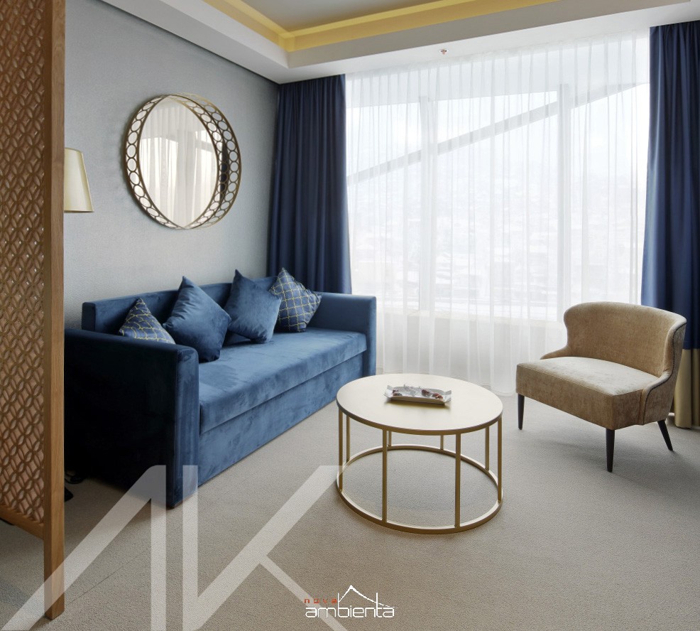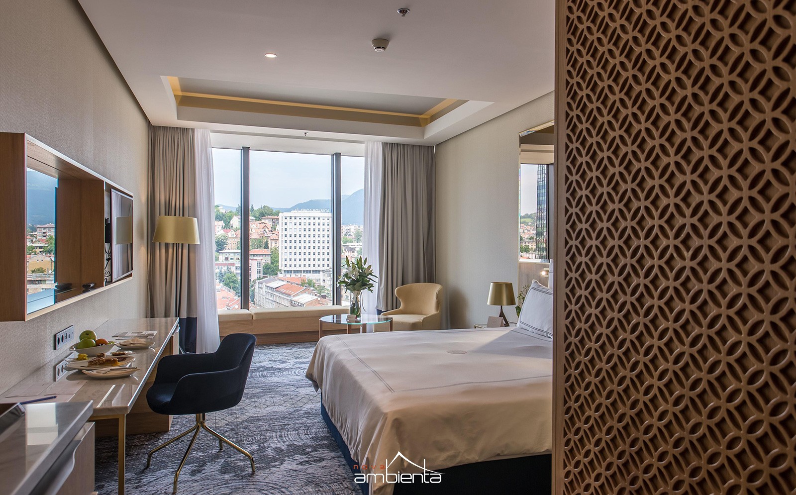 Der Fokus liegt auf funktionalem Design mit unerwarteten bosnischen und schweizerischen Akzenten, wobei besonderes Augenmerk auf die Qualität der verbauten Materialien gelegt wird. Der Innenraum basiert auf Klassikern mit traditionellen bosnischen, orientalischen und zeitgenössischen Elementen und steht somit im Kontrast zum äußeren Erscheinungsbild des Gebäudes, das den Stil des 21. Jahrhunderts widerspiegelt.